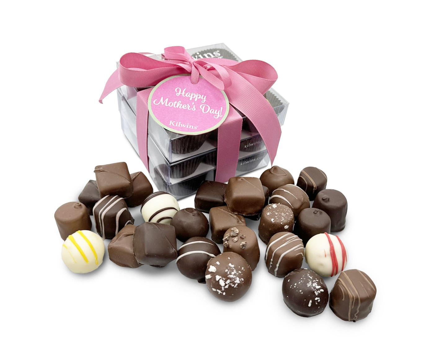 $47.99 per 14.5 oz. Give Mom a moment of Chocolate Bliss! An assortment of the finest Chocolate Truffles, Creams & Caramels for Mom, all wrapped up in a pretty pink bow! Quantity Mother's Day Chocolate Bliss Bundle Required* Add to cart Mother's Day Chocolate Bliss Bundle Product Details A bundle of the finest Kilwins chocolates, containing: 4.75 oz. Truffle Assortment:1 Mocha Truffle1 Almond Truffle1 Hazelnut Truffle1 Irish Cream Truffle1 Raspberry Truffle2 Dark Chocolate Truffles1 Malt Truffle4.75 oz. Caramel Assortrment:5 Milk Chocolate Caramels4 Dark Chocolate Caramels5 oz. Cream Assortment:1 White Chocolate Lemon Cream1 Chocolate Bon Bon1 Strawberry Bon Bon1 Milk Chocolate Vanilla Buttercream1 Milk Chocolate Orange Cream1 Milk Chocolate Raspberry Cream1 Dark Chocolate Vanilla Buttercream1 Dark Chocolate Orange Cream1 Dark Chocolate Raspberry Cream